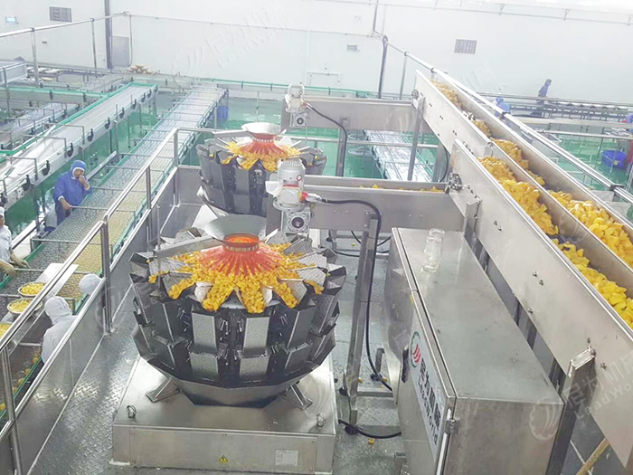 (2)按主機能力配置不同規(guī)模的連續(xù)化生產線。故蘿生產線視四道機(去皮、切端、通芯、括肉)的能力80個/min機分級規(guī)格進行配置。桃子生產線視桃瓣挖核機的能力70~80個/min及分級規(guī)格進行配置。火腿生產線能力750kg、1000kg、1500kg、2000kg進行配置。