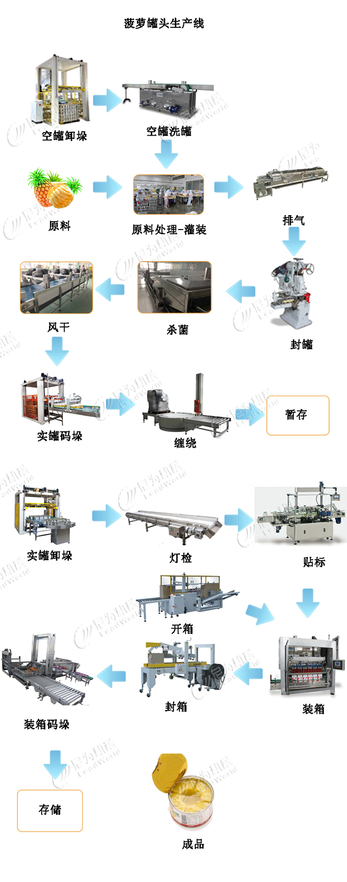 尼為為您提供全套的菠蘿罐頭生產(chǎn)線設(shè)備,菠蘿通過預(yù)處理、調(diào)味后,需要進(jìn)行裝罐、真空密封、殺菌、貼標(biāo)、裝箱、全自動(dòng)碼垛機(jī)。這樣既保持了菠蘿的口感又解決了菠蘿的儲(chǔ)存問題。